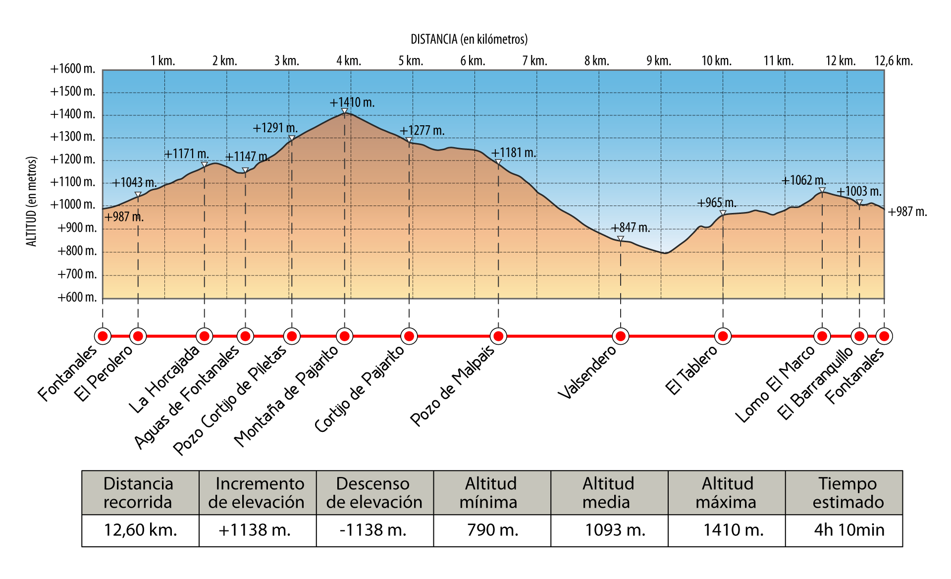 Fontanales – El Perolero – La Horcajada – Aguas de Fontanales – Pozo Cortijo de Piletas – Montaña de Pajarito – Cortijo de Pajarito – Pozo de Malpaís – Valsendero – El Tablero – Lomo El Marco – El Barranquillo – Fontanales
