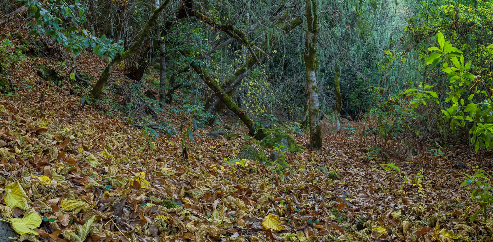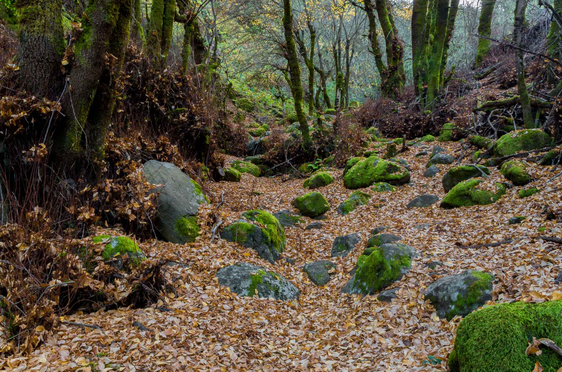 Algo más adelante, después de pasar dos mini-barranquillos casi imperceptibles, atravesamos directamente una zona con castaños (25). Bajamos unos pocos metros hasta encontrar un camino que va girando a nuestra izquierda y que por un momento atraviesa una zona con piedras desprendidas (26).