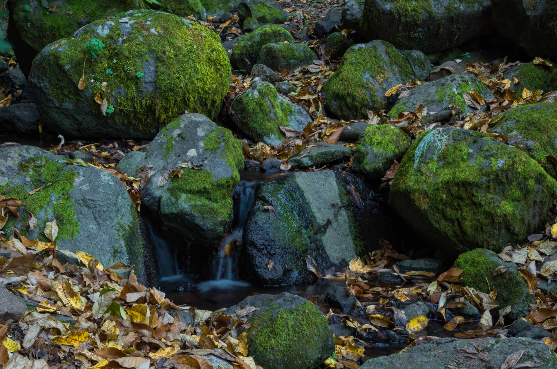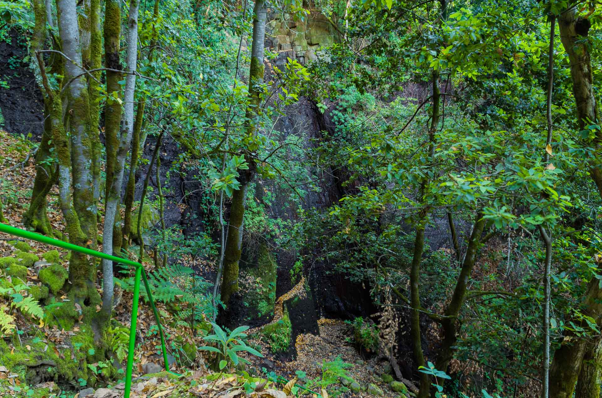 Avanzamos de frente sin camino realmente definido hasta llegar a una zona muy sombría que se adentra en el interior del barranco. Bajamos el pequeño desnivel ayudándonos de la barandilla para llegar finalmente al Caidero Navarro (27), donde hay una cascada y una acequia de agua.