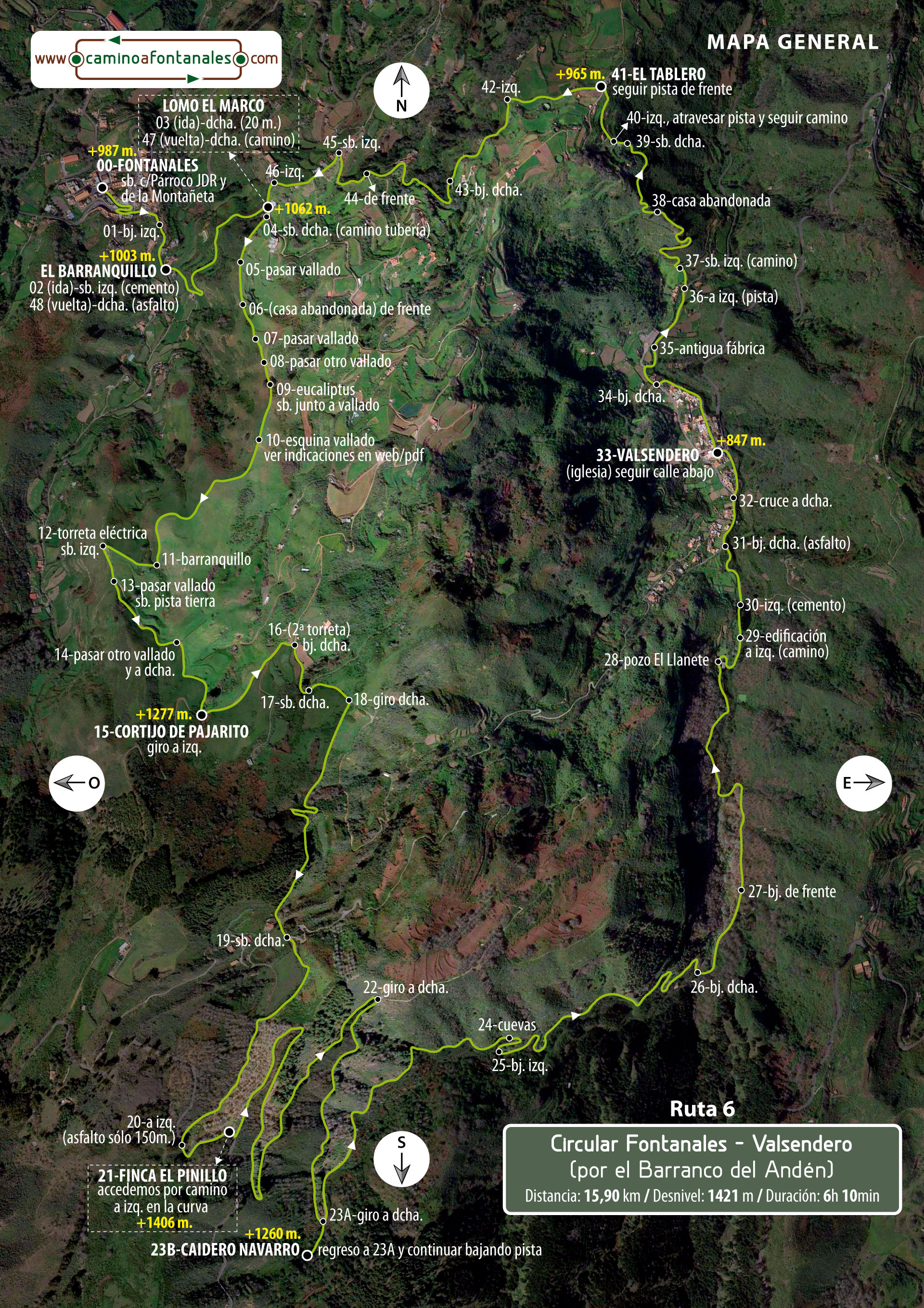 Esta ruta parte de la Plaza de Fontanales, situada a +987 m. de altitud y llega al pueblo de Valsendero pasando por el Barranco del Andén, a través de la Finca El Pinillo. Se trata de una finca privada propiedad de la Heredad de Aguas de Arucas y Firgas, por lo que previamente será preciso solicitar autorización para atravesarla. El trámite se realiza a través de correo electrónico y es gratuito. Para informarse, llamar al teléfono 928 60 01 03 o por e-mail: heredadarucasyfirgas@hotmail.com